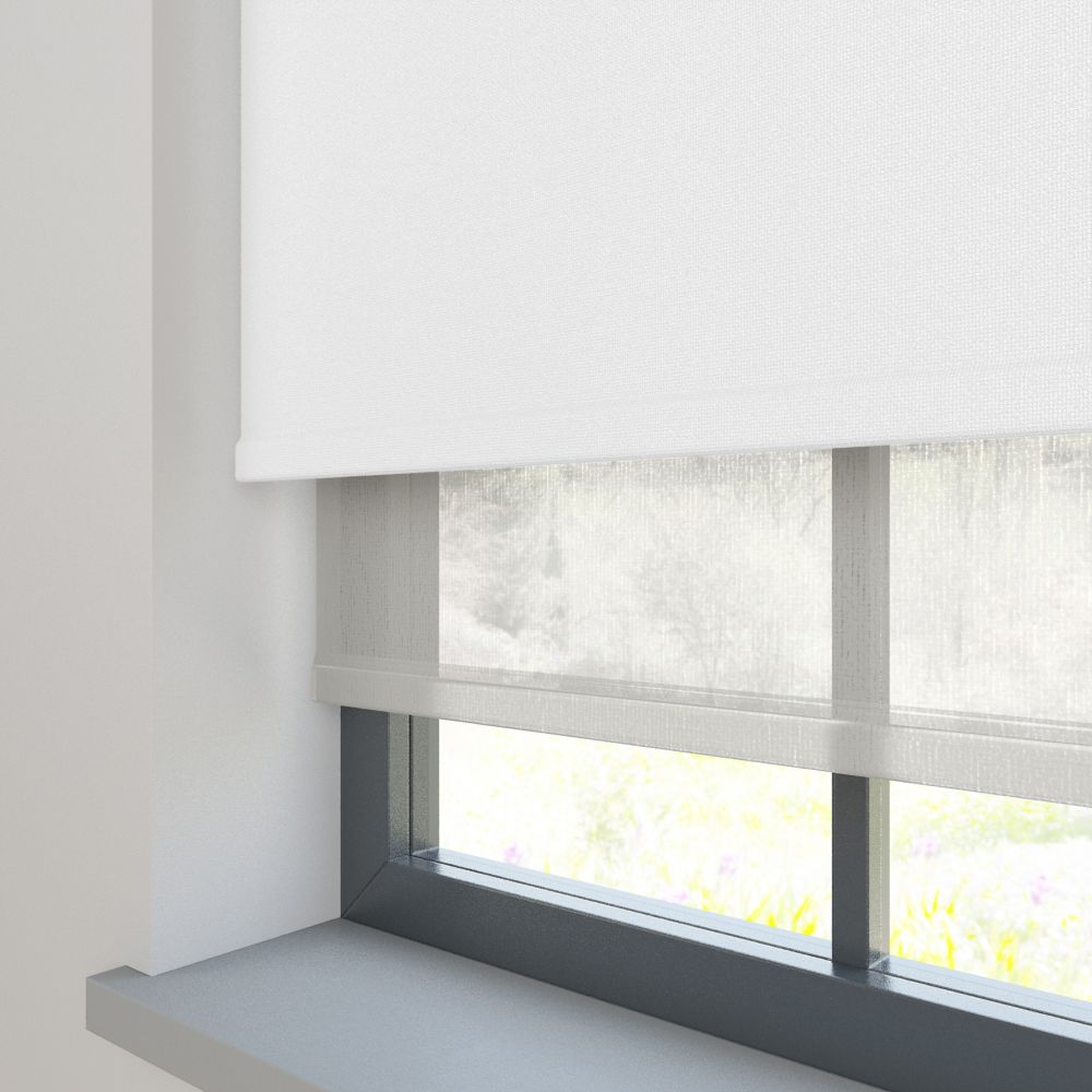 Combining two of our most popular roller blinds in one, this Amor Snowfall and Haze Soft Grey double roller blind gives you the best of both worlds. Keep the voile down in the day for light and privacy, then at night lower the blackout Amor soft grey to block out the light.